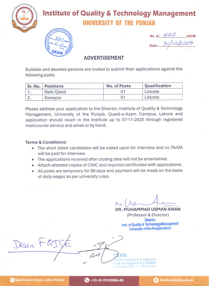 Job Type: SITUATION VACANT - Naib Qasid and Sweeper (posts purely on a Daily Wages / Contingent Basis)